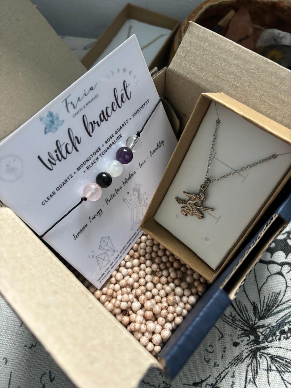 pack with mystical Crystals and a sterling silver 925 necklace with a flying witch pendant